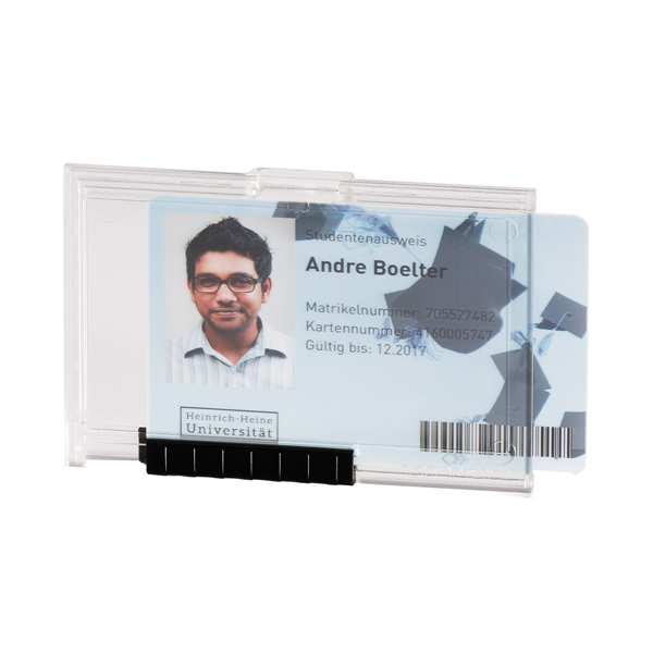 Elegante portabadge con comparti separati per contenere e proteggere 1 tessera formato 54x87mm. Utilizzabile sia in posizione orizzontale sia verticale. Perfetto per proteggere tessere con chip RFID e con banda magnetica. Levette scorrevoli per una facile espulsione delle tessere. In plastica trasparente crystal-clear di alta qualit.