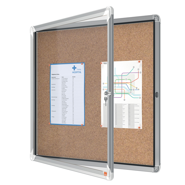 Ad anta battente. Nuovo design con robusta cornice in alluminio e vetro di sicurezza di 4mm. fondo fondo in sughero per uso con puntine. Fissaggio semplice effettuabile da una sola persona. Serratura con 2 chiavi. Apertura istallabile sia a destra che a sinistra. f.to 6xa4. DImensioni: 70,8×66,7×4,3cm