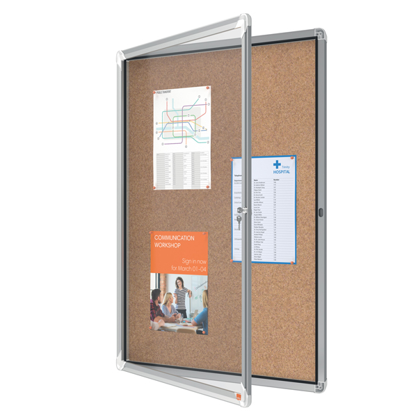 Ad anta battente. Nuovo design con robusta cornice in alluminio e vetro di sicurezza di 4mm. fondo fondo in sughero per uso con puntine. Fissaggio semplice effettuabile da una sola persona. Serratura con 2 chiavi. Apertura istallabile sia a destra che a sinistra. f.to 9xa4: dim.est. 1000x752x37mm