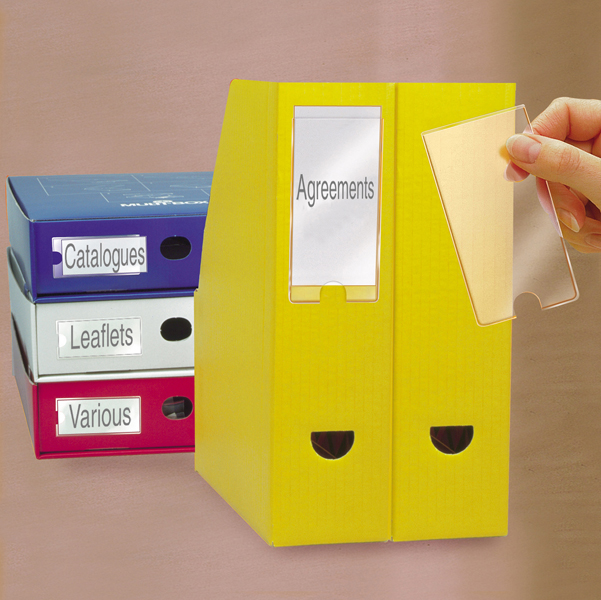 Portaetichette in polipropilene autoadesivi, permanenti e trasparenti, dotati di etichette di carta scrivibili, stampabili e intercambiabili. Comoda apertura a semicerchio che permette di inserire e rimuovere agevolmente gli inserti. Ideali per contrassegnare in modo semplice e rapido raccoglitori, registratori, archivi, ecc… Formato 62×150 mm.