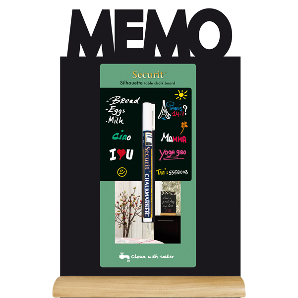 Formate da una base in legno duro laccato che sorregge una lastra removibile e scrivibile da entrambi i lati. fornire con un marcatore a gesso liquido bianco.