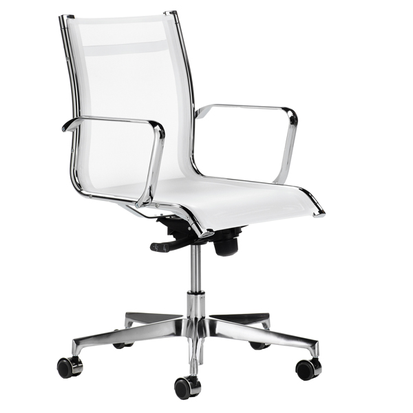 Poltrona direzionale girevole con elevazione a gas – meccanismo oscillante con blocchi. Rivestimento seduta in rete di colore bianco. Braccioli inclusi (non rimovibili). Alt.tot.: 79-90cm Prof.tot.: 68cm Alt.schienale: 41cm Larg.schienale: 48cm Larg.seduta: 50cm Prof.Sedile: 50cm.