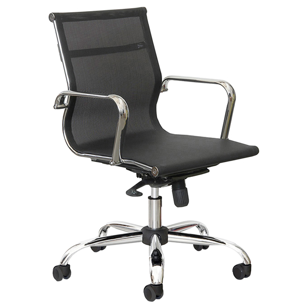 Poltrona direzionale girevole con elevazione a gas – meccanismo oscillante con blocco. Rivestimento seduta in rete di colore nero. Braccioli inclusi (non rimovibili). Alt.tot.: 91-103cm Prof.tot.: 66cm Alt.schienale: 53cm Larg.schienale: 46cm Larg.seduta: 48cm Prof.Sedile: 45cm.