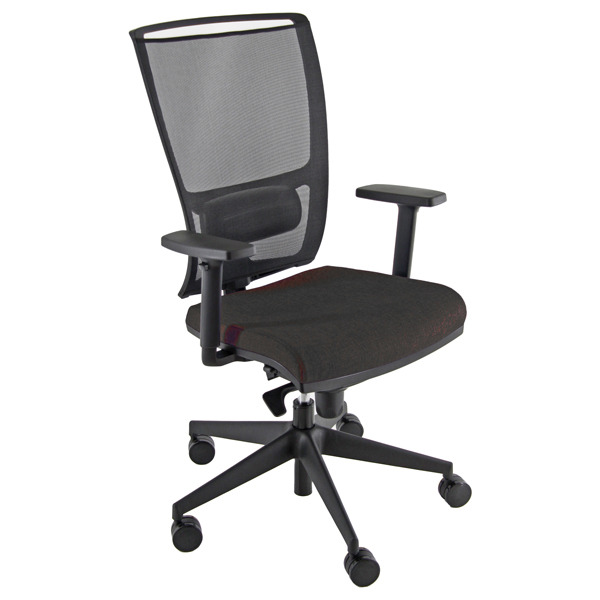 Poltrona semidirezionale H12 (adatta per uso intenso). Schienale alto in rete nera con supporto lombare regolabile. Rivestimento seduta in acrilico ignifugo. Braccioli regolabili e base in nylon. Meccanismo syncro. Meccanismo anti shock, meccanismo a contatto permanente. Schienale regolabile up-down. sedile con traslatore regolabile in profondit. Elevazione a gas.