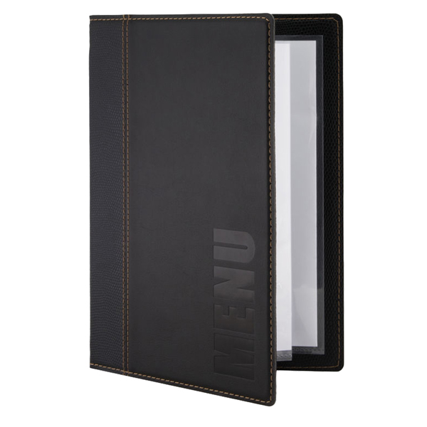 porta menu’ in similpelle con un inserto doppio. scritta ”menu” stampata