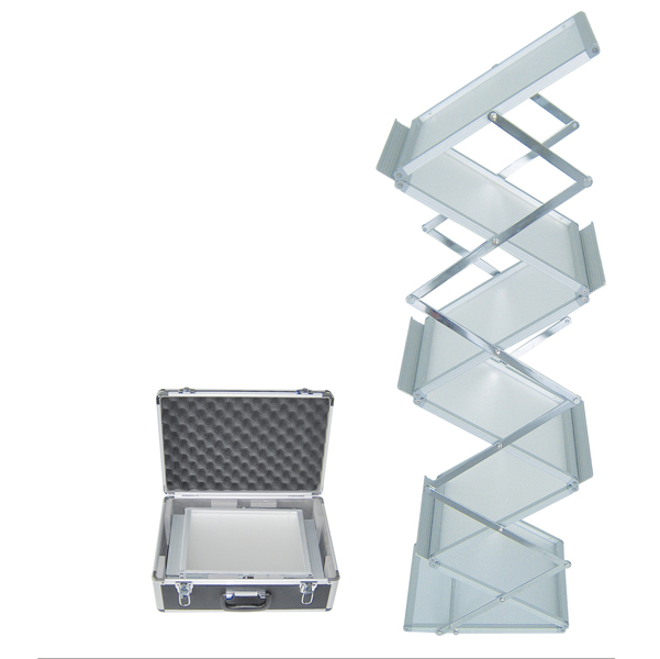 Espositore ideale per essere trasportato, poichÜ ripiegabile. realizzato in alluminio anodizzato con 5 ripiani in plexiglass satinato formato a4. Dotato di fermo di sicurezza al piede per garantire stabilitô all’espositore quando aperto. La struttura ripiegata contenuta in un’elegante valigetta. 31x28x135cm – 5 ripiani a4