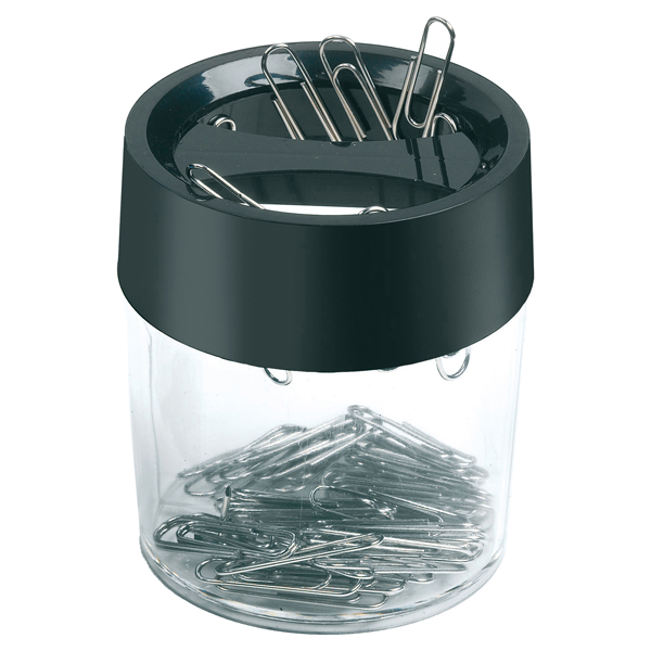 Portafermagli con coperchio calamitato in plastica trasparente, di forma cilindrica. Formato da due spazi separati per differenti fermagli, dimensioni: 5,8×6,8cm.