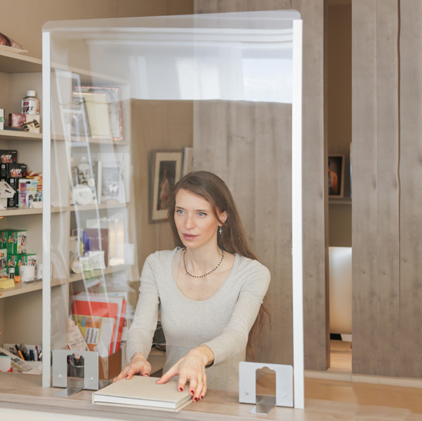 schermo protettivo da banco con feritoia h76xl66cm in acrilico grigio alluminio