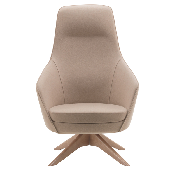Poltroncina su basamento girevole in legno di frassino verniciato. Rivestimento seduta in tessuto PLUS – Eco Leather idrorepellente, facile da pulire, senza flatati e flame retardant. Alt.tot.: 111cm Prof.tot.: 80cm Larg.tot.: 75cm.