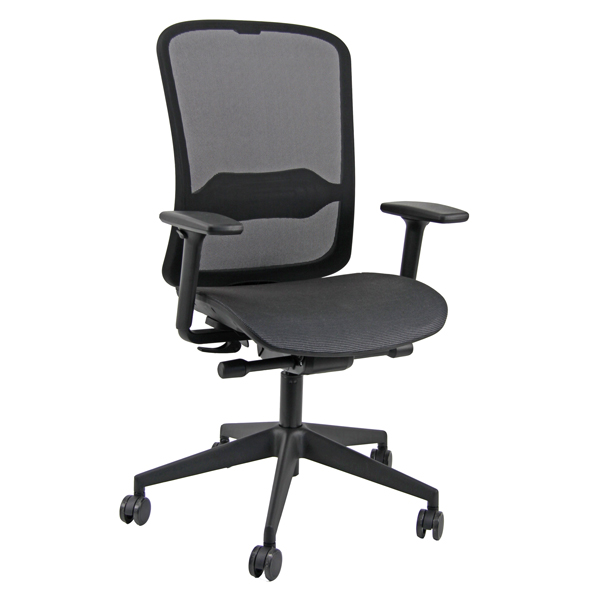 Sedia girevole su ruote con sedile in rete portante e schienale in rete nera, elevazione a gas. Supporto lombare regolabile, meccanismo syncro tra sedile e schienale, a contatto permanente. Schienale con ritorno controllato con 4 blocchi antishock. Sedile dotato di traslatore (avanti e indietro). Completa di braccioli regolabili. Alt.tot: 105-107cm Prof.tot: 68cm Alt.schienale: 60cm Largh.schienale:47cm Largh.sedile: 48cm Prof.sedile: 46cm Alt.sedile: 40-52cm.
