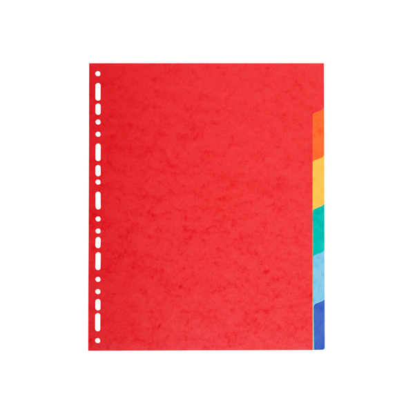 Divisori in cartoncino riciclato (certificazione Blue Angel) da 220 gr. Dotati di 6 tasti neutri colorati (colori assortiti). Perforazione universale. Formato esterno: 24,2×29,7 cm.